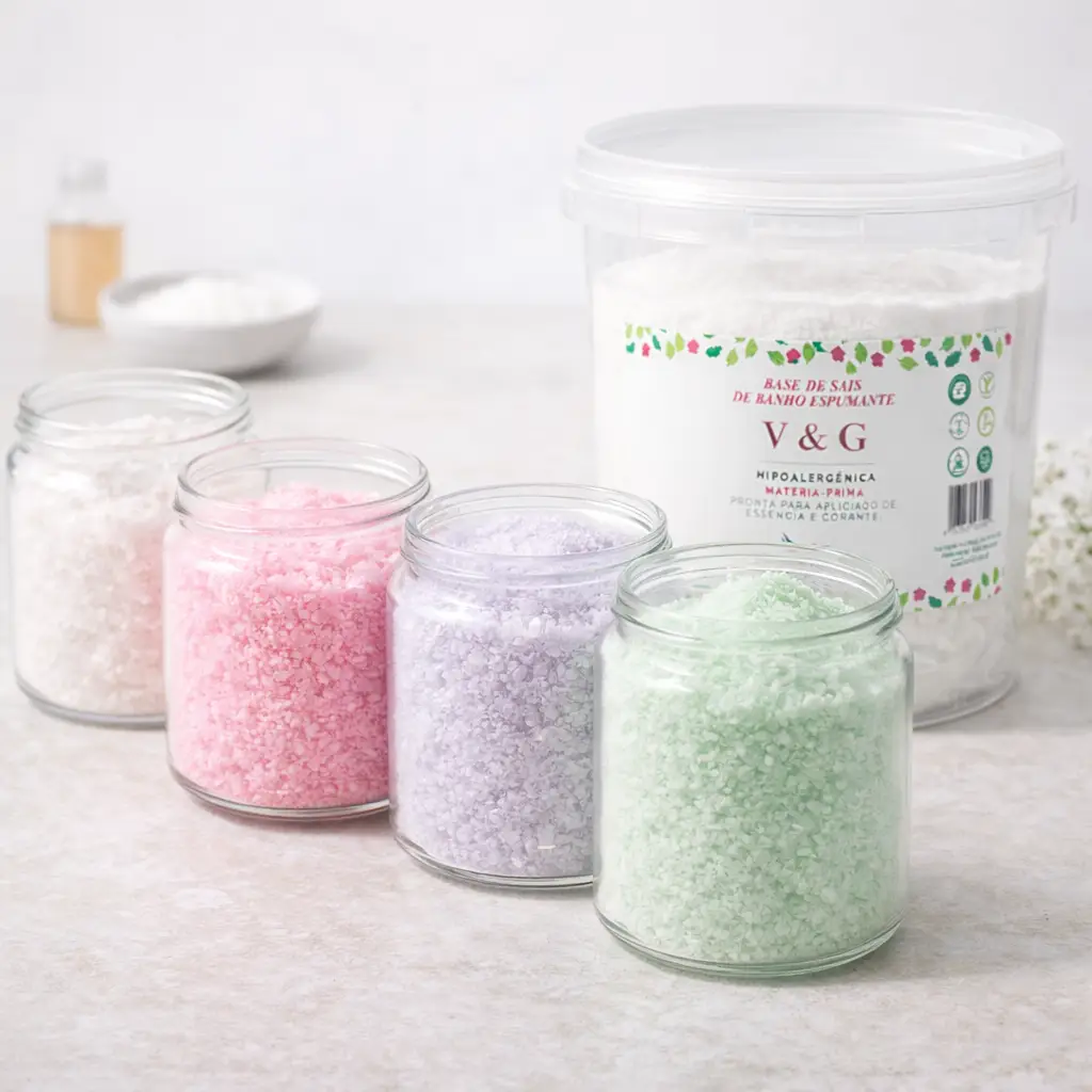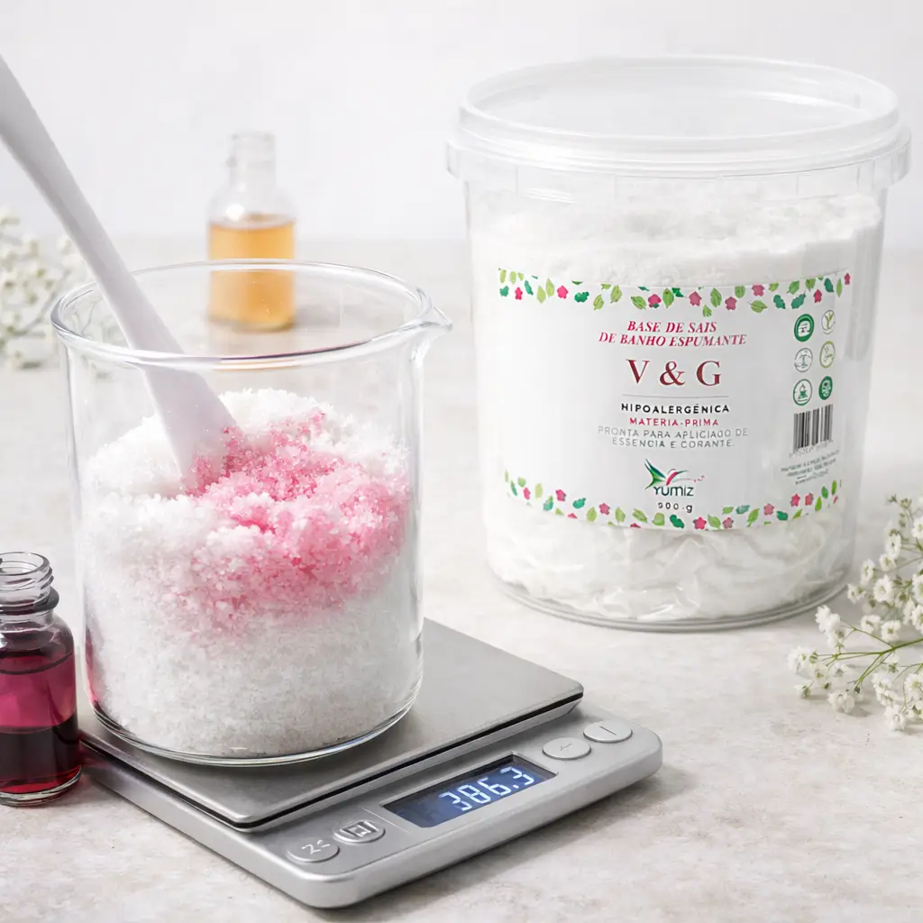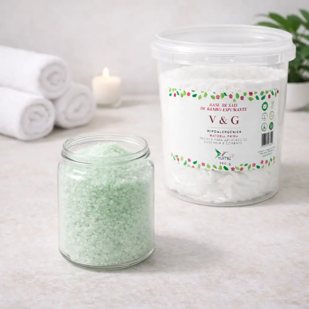 Base Sais de Banho Espumante Vegetal V&G Quimiz 900g é a escolha ideal para quem deseja produzir sais de banho artesanais com qualidade profissional, ética e excelente desempenho. Desenvolvida com ingredientes de origem vegetal, essa base permite a criação de produtos personalizados, valorizando o cuidado com a pele e o compromisso com uma produção consciente.